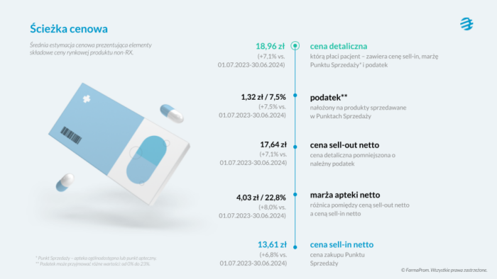 Raport szczegółowo przedstawia składowe ceny rynkowej produktu non-RX. Cena, którą finalnie płaci pacjent (18,96 zł), jest wynikiem kilku czynników, z których każdy odnotował wzrost.